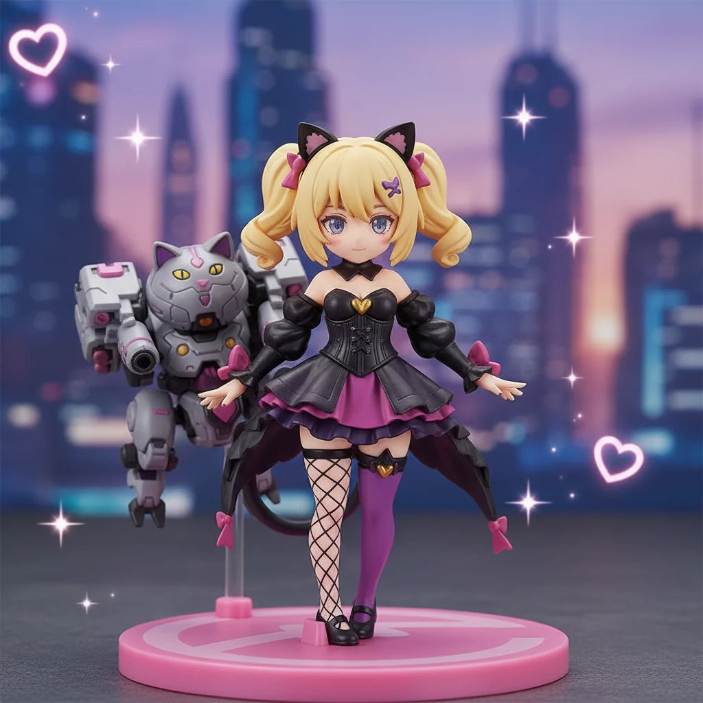 The figure itself is the character on its pink base. The whimsical background with glowing heart shapes is part of the series' aesthetic, enhancing its display appeal.